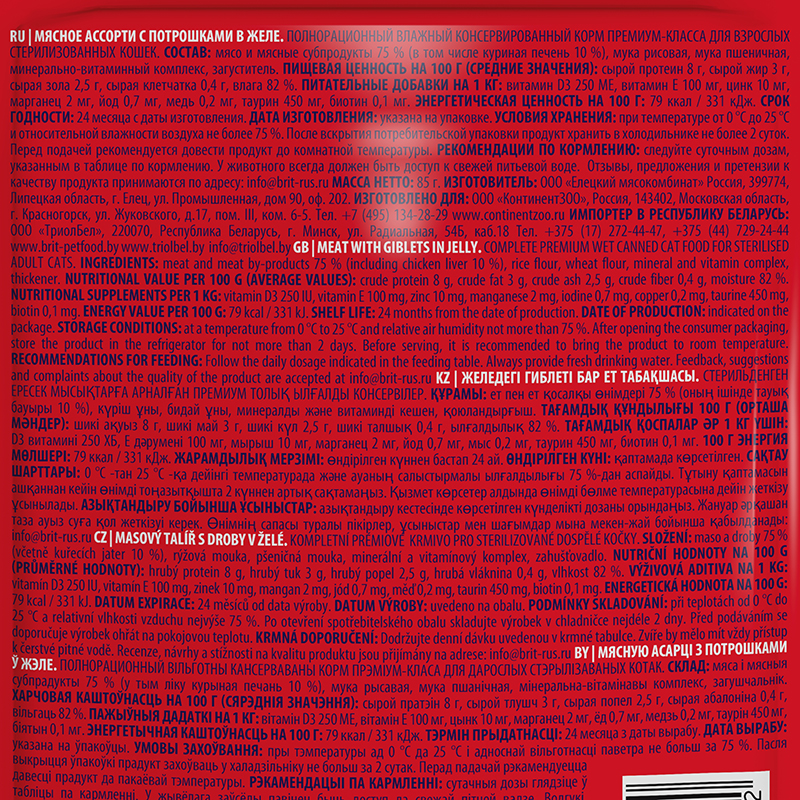 Корм Brit Premium Sterilised Meat & Giblets (в желе) для стерилизованных кошек, мясное ассорти с потрошками, 85 г