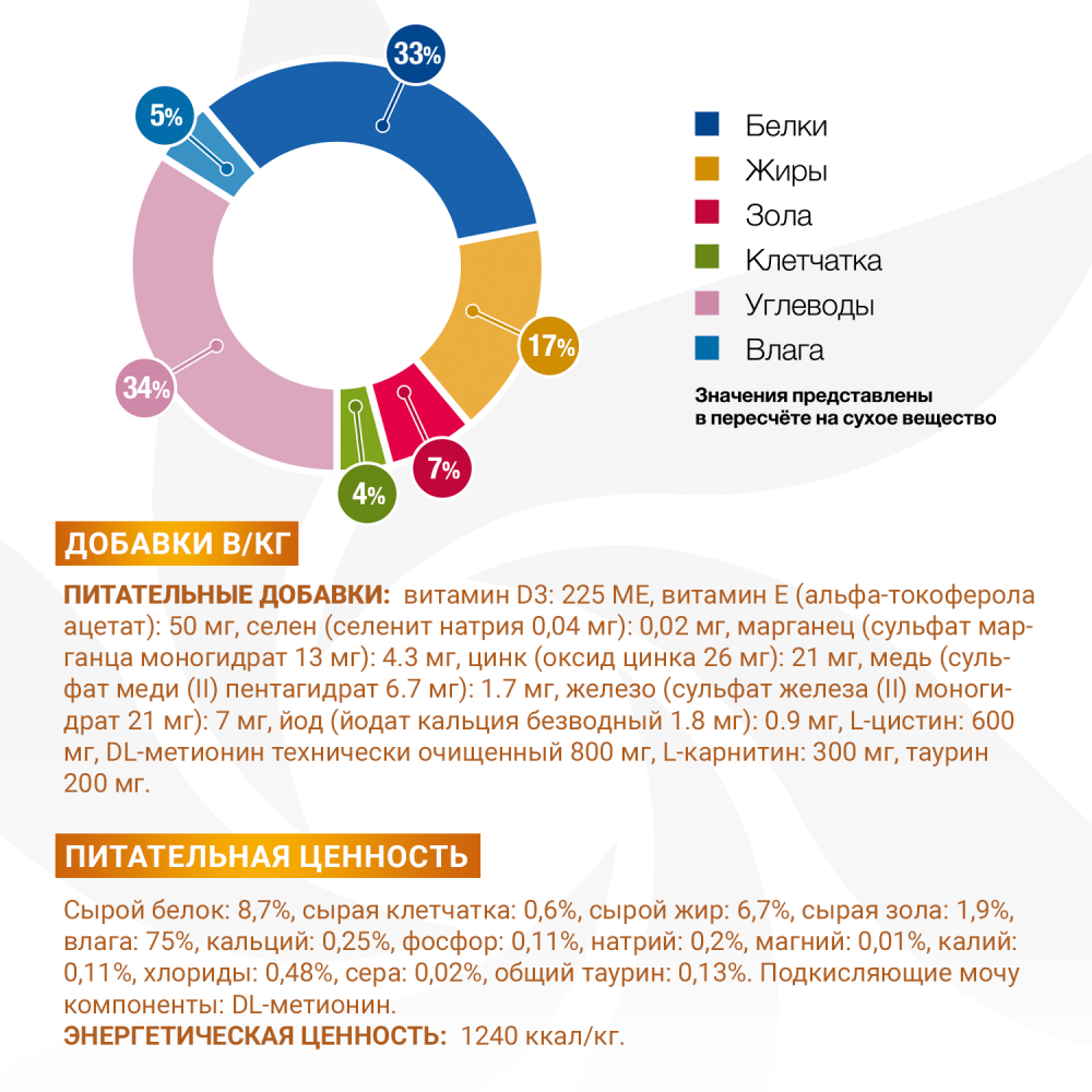 Питательная ценность: сырой белок 8,7%, сырая клетчатка 0,6%, сырой жир 6,7%, сырая зола 1,9%, влага 75%, кальций 0,25%, фосфор 0,11%, натрий 0,2%, магний 0,01%, калий 0,11%, хлориды 0,48%, сера 0,02%, общий таурин 0,13%.nПодкисляющие мочу компоненты: DL-метионин.