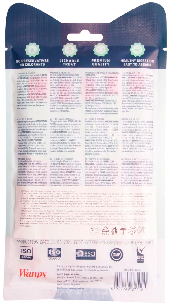 Wanpy Cat Лакомство для кошек «нежное пюре» из тунца и гребешка 70 г