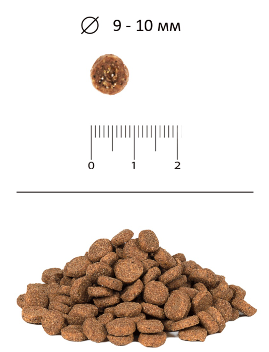 Дегидрированное мясо курицы (30%), цельная кукуруза, гидролизованный белок, цельный рис, сушеная мякоть свеклы, гидролизованная и дегидратированная печень, куриный жир, альбумин, витаминно-минеральный комплекс (витамины: А, Д3, Е, холин хлорид, бетаин, В3, В5, В2, В1, В6, фолиевая кислота, В12, калий, цинк, железо, марганец, медь, йод, селен, таурин), кукурузные рыльца, дегидратированное яйцо, дрожжи - источник мананн-олигосахаридов (MOS), сушеные яблоки, семена льна, рыбий жир, клюква, антиоксидант, DL-Метионин, L-карнитин, экстракты розмарина и фенхеля, топинамбур, пробиотик - живые микроорганизмы Bacillus subtilis и Bacillus licheniformis, экстракт юкки Шидигера, экстракт фукуса.