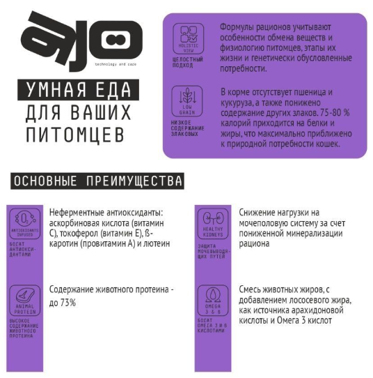 AJO — это полезный, сбалансированный корм для кошек и собак супер-премиум класса, созданный в парадигме HOLISTIC VIEW. При создании корма мы использовали целостный подход и соединили последние научные достижения и базовые принципы правильного питания питомцев.Выверенные формулы учитывают физиологические параметры, этапы жизни, особенности