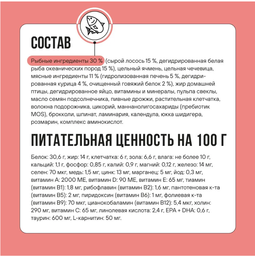 СоставnРыбные ингредиенты 30 % (сырой лосось 15 %, дегидрированная белая рыба океанических пород 15 %), цельный ячмень, цельная чечевица, мясные ингредиенты 11 % (гидролизованная печень 5 %, дегидрированная курица 4 %, очищенный говяжий белок 2 %), жир домашней птицы, дегидрированное яйцо, витамины и минералы, пульпа свеклы, масло семян подсолнечника, пивные дрожжи, растительная клетчатка, волокна подорожника, цикорий, маннанолигосахариды (пребиотик MOS), брокколи, шпинат, ламинария, календула, юкка шидигера, розмарин, комплекс аминокислот.