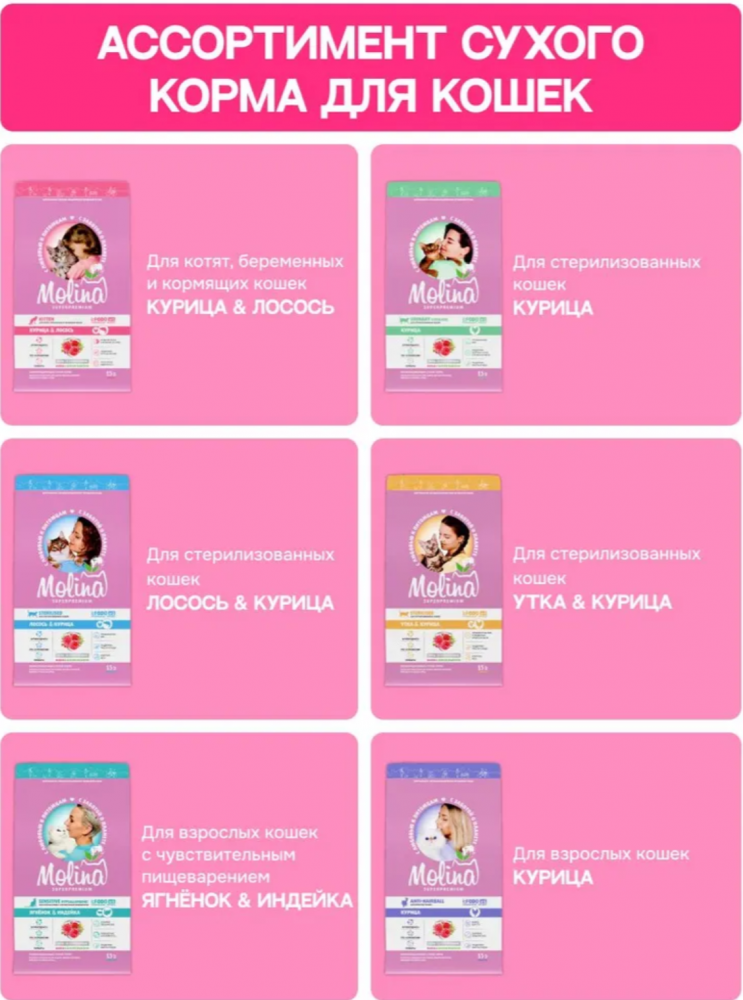 Новая линейка сухих кормов Molina для кошек и собак создана с учетом рекомендаций по питанию животных, ведущих малоподвижный образ жизни. Мы разработали специальную низкокалорийную формулу. Molina: меньше калорий — больше здоровья! Витамины и белок в идеальном тандеме. Источники белка: • Сбалансированный белок сохраняет мышечную