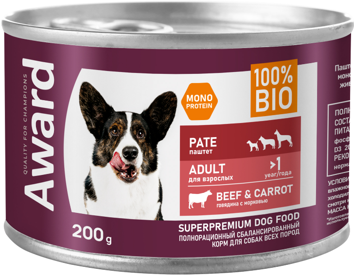 Влажный корм AWARD для взрослых собак паштет из говядины с морковью 200г