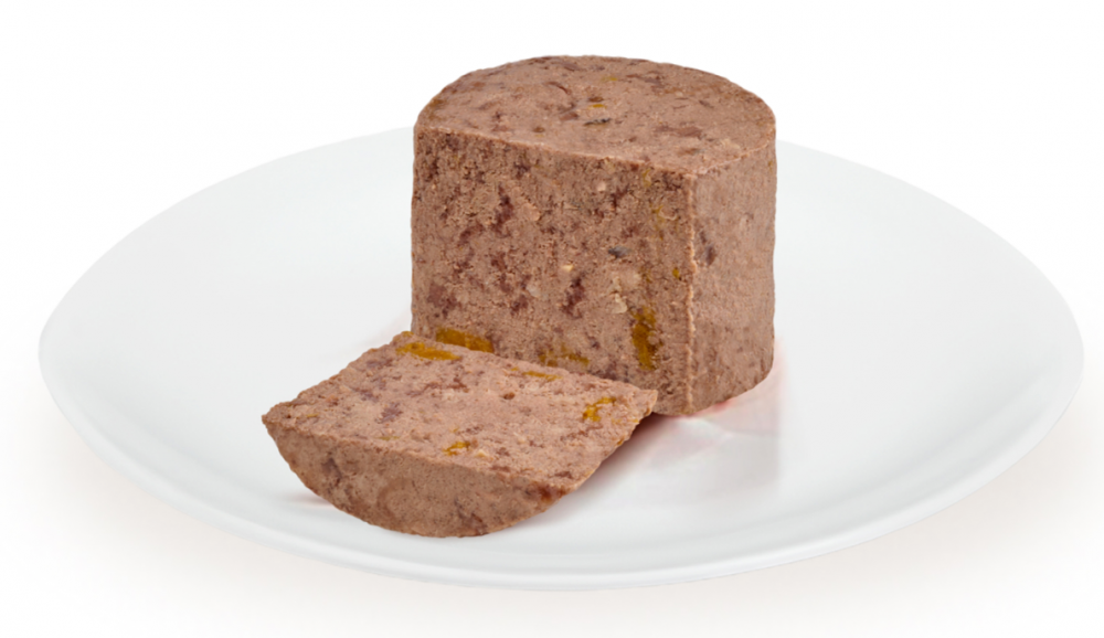 Состав: телятина 58%, ветчина свиная 10%, витамины, минеральные вещества, свекловичная клетчатка, льняное масло 0,1%.