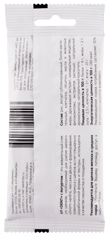 Biff «DENT» с йогуртом – это жевательный снек для щенков, необходимый для снятия мягкого зубного налёта, массажа дёсен и формирования правильного прикуса у щенков за счет специально разработанной формы и текстуры, используется в качестве лакомства и поощрения. Рекомендуется для щенков мелких и средних пород. Подробнее