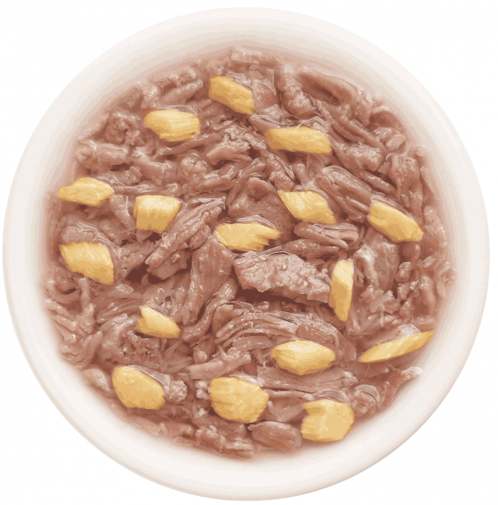 Состав: утка 54 %, лосось 6 %, бульон из утки 38 %, натуральная желирующая добавка.nПищевые добавки: пивные дрожжи (источник пребиотика МОС), пребиотик ФОС, рыбий жир (анчоус), витамин Е, таурин, минералы.nПищевая ценность, %: протеин — 11, жиры — 2, клетчатка — 1, зола — 1,5, влажность — 89; энергетическая ценность — 55 ккал.