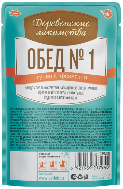 Влажный корм Деревенские лакомства Обед № 1. Тунец с креветкой нежный паштет 50 г