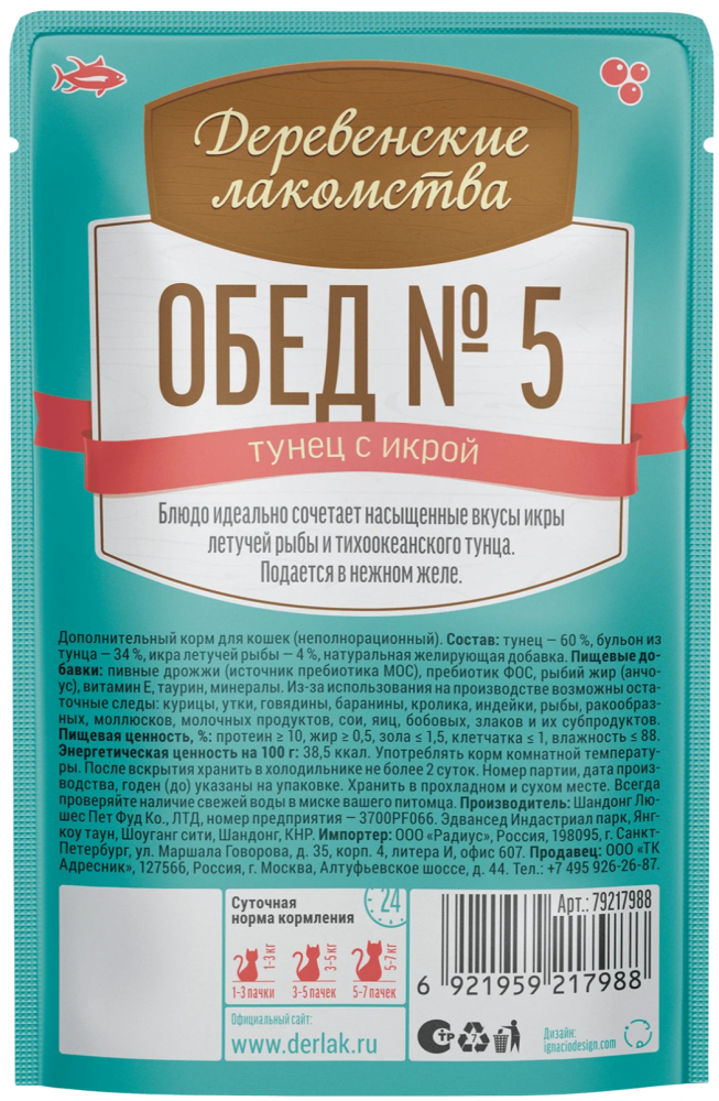 ПАУЧ Деревенские лакомства Обед № 5. Тунец с икрой: ЖЕЛЕ 50 г для кошек