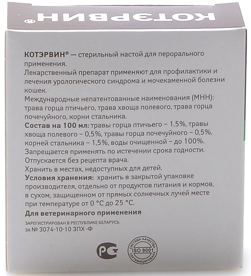 КОТЭРВИН — лекарственный препарат растительного происхождения, предназначенный для профилактики и лечения болезней мочевыводящих путей у кошек: