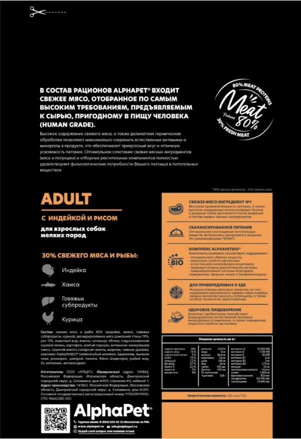 Сухой корм Alphapet Superpremium с индейкой и рисом для собак мелких пород