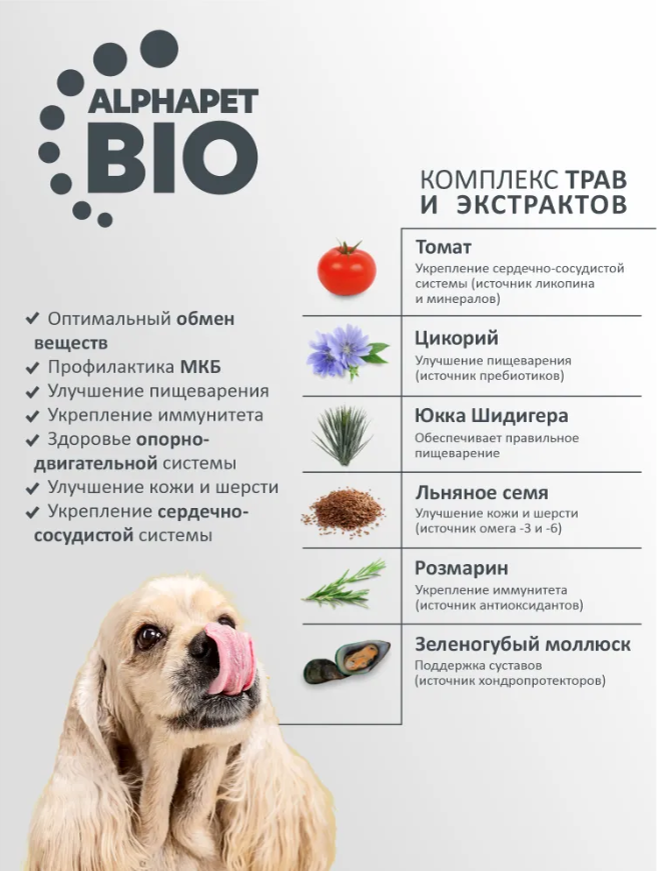 свежее мясо и рыба 30% (индейка, хамса, говяжьи субпродукты, курица), дегидрированное мясо птицы 19% (курица, индейка), рис 13%, животный жир, ячмень, чечевица, яблоко, гидролизованная куриная печень, картофель, желтый горошек, витаминно-минеральная смесь, сушеная мякоть сахарной свеклы, морковь, пивные дрожжи, комплекс AlphaPetBIO® (зеленогубый моллюск, одуванчик, льняное семя, розмарин, цикорий, томаты, Юкка Шидигера), рыбий жир, DL-метионин, антиоксидант.