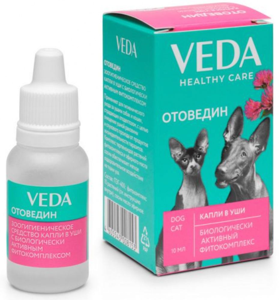 Капли ушные содержат ПЭГ-400; фитокомплекс: цветков пижмы, травы чабреца, травы душицы, травы полыни горькой, травы фиалки, цветков клевера красного, цветков бузины черной, травы коровяка, почек сосны, чеснока; эфирное масло сосновое. Средство представляет собой однородную вязкую жидкость без посторонних включений, допускается опалесценция, от бесцветного до светло-желтого цвета, со специфическим запахом, характерным для эфирного масла соснового. Отоведин выпускают расфасованным по 5, 10, 15 мл во флаконы-капельницы, помещенные вместе с инструкцией по применению в пачки из картона коробочного. Применяют для гигиенического ухода за ушами собак и кошек при отодектозе (ушной чесотке) с целью очищения ушной раковины и слухового прохода от продуктов жизнедеятельности паразитов. Комплекс терпеноидов эфирного масла сосны и экстрактов 9 целебных растений обладает акарицидными свойствами и обеспечивает мягкое оздоровительное воздействие на ткани уха. Обработку проводят до полного очищения ушной раковины от признаков отодектоза. Подробнее